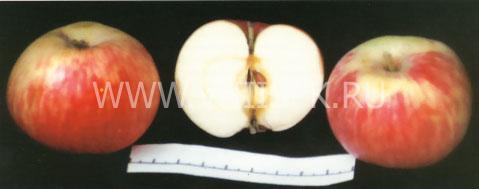 Плоды (рис.) раннелетнего созревания, нижесредней величины или мелкие, сильноуплощенные (почти репчатые), слаборебристые. Кожица гладкая. Основная окраска желтовато-зеленая, белеющая при созревании. Покровная окраска в виде легкого размытого румянца и розовых полос и крапин на нем. Подкожные точки многочисленные, беловатые. Плодоножка короткая, средней толщины или толстая. Воронка глубокая, широкая, без оржавленности. Блюдце мелкое, широкое. В основании чашелистиков обычно хорошо видны вздутые бугорки ("перлы"). Чашечка закрытая. Сердечко репчатое. Семенные камеры закрытые. Семена средней величины, светло-каштанового цвета.